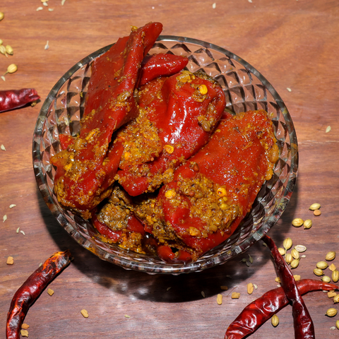 Khambani Red Chilli Pickle is a bold, flavorful delicacy crafted using traditional Indian methods. We select plump red chillies, sun-dry them to perfection, and stuff them with a handcrafted masala made of roasted spices and natural rock salt. The stuffed chillies are then slow-cured in cold-pressed mustard oil, allowing every flavor to mature and deepen over time.