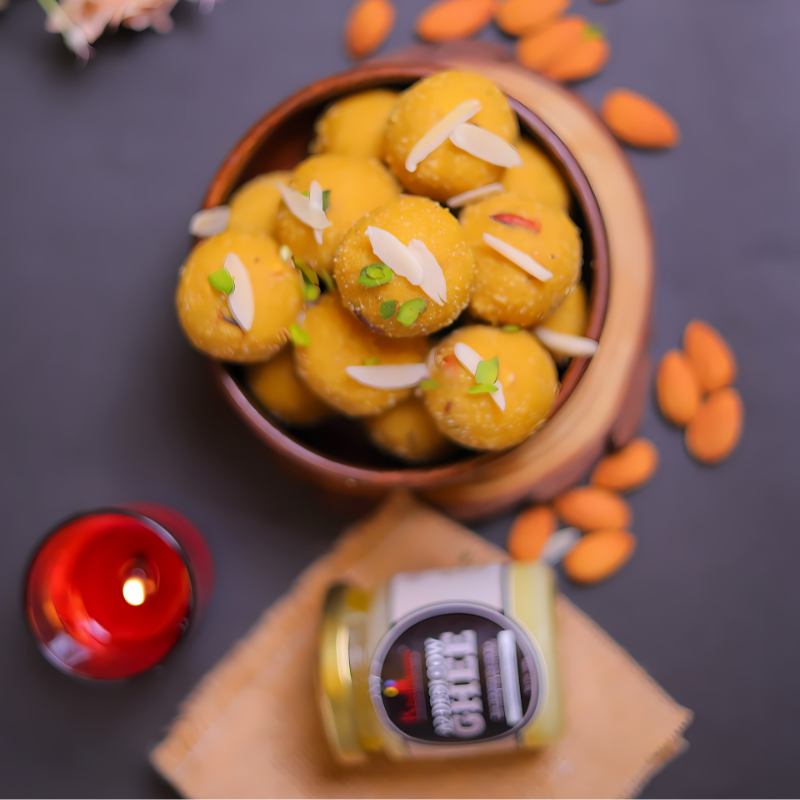 Each laddoo is hand-rolled by women artisans in small batches to preserve texture, aroma, and taste. The rich, nutty flavour of roasted besan blends beautifully with the earthy ghee and sweetness of unrefined sugar, creating a melt-in-mouth experience that feels like home.