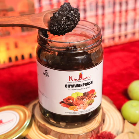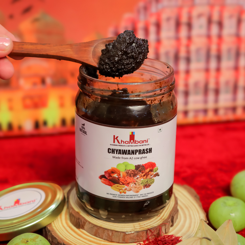 At Khambani, we believe in healing with purity. Our Chyawanprash is crafted using fresh kaccha Amla, 54 time-tested Ayurvedic herbs, A2 desi cow ghee, raw honey, and sesame oil, following the recipes described in ancient texts. Each batch is handmade with care to preserve the potency, flavor, and natural goodness of the ingredients.
