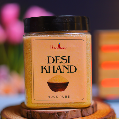 Khambani Desi Khand is a traditional natural sweetener made from pure sugarcane juice, processed without chemicals or bleaching. Unlike refined sugar, Desi Khand retains essential minerals, nutrients, and its natural earthy taste, making it a healthier alternative for everyday sweetness.