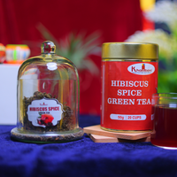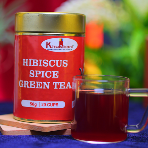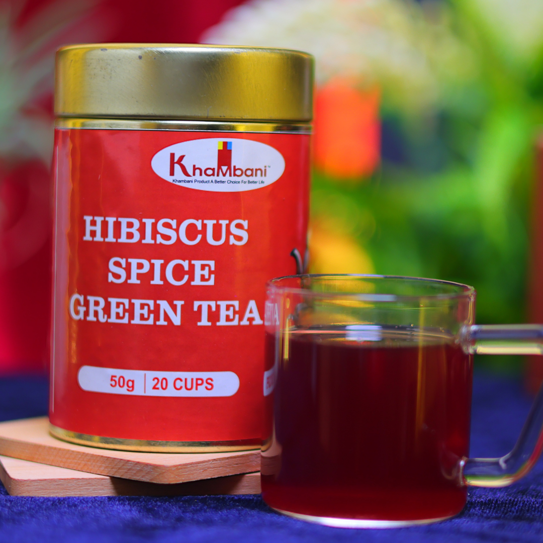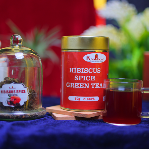 Khambani Hibiscus Green Tea is a vibrant blend of premium green tea leaves and dried hibiscus petals, bringing together the tangy-sweet taste of hibiscus with the gentle freshness of green tea. This refreshing infusion is not only delicious but also packed with antioxidants, making it a perfect choice for daily wellness.