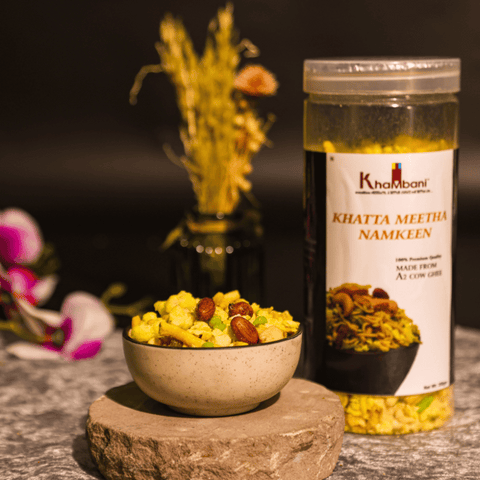 Indulge in the authentic taste of Khambani Khatta Meetha Namkeen, lovingly prepared using 100% pure A2 desi cow ghee. Each bite delivers a perfect crunch and rich flavor, crafted with natural ingredients and free from any artificial preservatives or chemicals.
