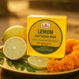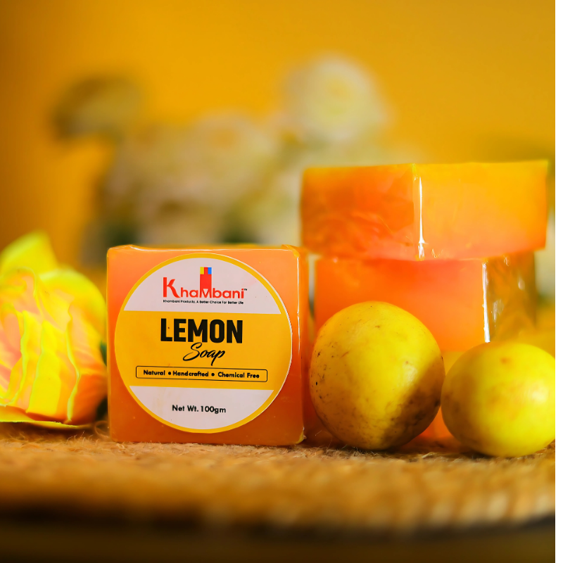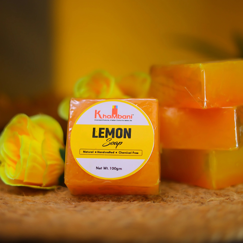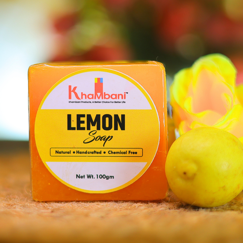 Khambani Lemon Bar – Handmade Ayurvedic bathing soap enriched with lemon peel and citrus oils. Gently exfoliates, detoxifies, and refreshes skin while controlling excess oil and odor.