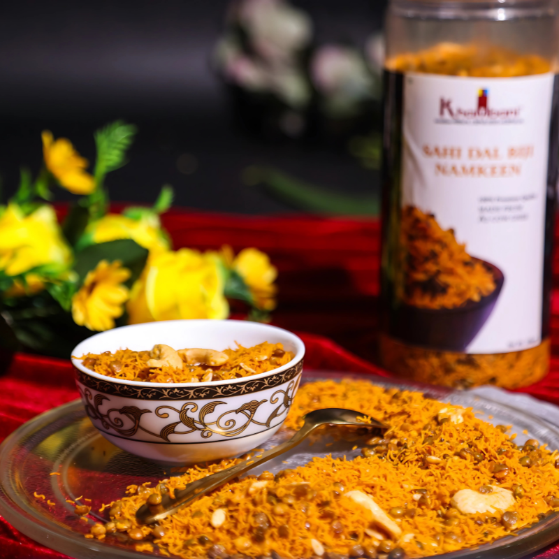 Khambani Sahi Dal Biji Namkeen is a traditional blend of crunchy lentils, sev, and mild spices — all roasted or fried in desi ghee for a richer, more wholesome taste. This namkeen offers a perfect balance of texture and flavor, making it ideal for serving during festivals, family gatherings, or enjoying as an everyday teatime snack.|