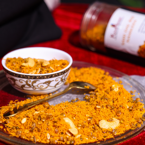 Handcrafted in small batches, this mix brings together multiple ingredients in harmony, while still remaining sattvic — free from onion, garlic, or refined oils. It’s satisfying without heaviness, offering both nutrition and nostalgic flavor.