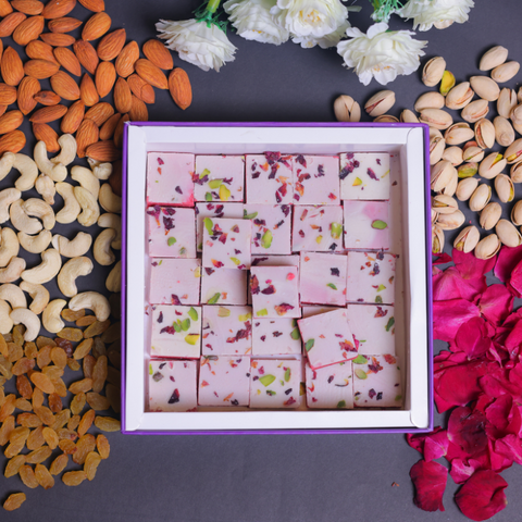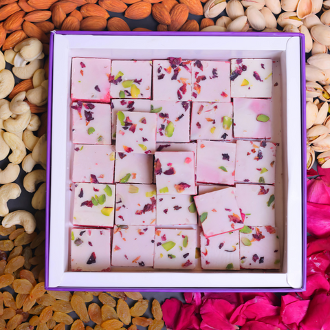 Khambani’s Strawberry Burfi brings a playful fusion of classic Indian mithai and fruity freshness. Infused with natural strawberry essence and blended into a rich khoya base, this soft, creamy burfi delivers the nostalgic feel of traditional sweets with a hint of berry brightness. The subtle pink hue and delicate aroma make it a favorite among kids and adults alike.