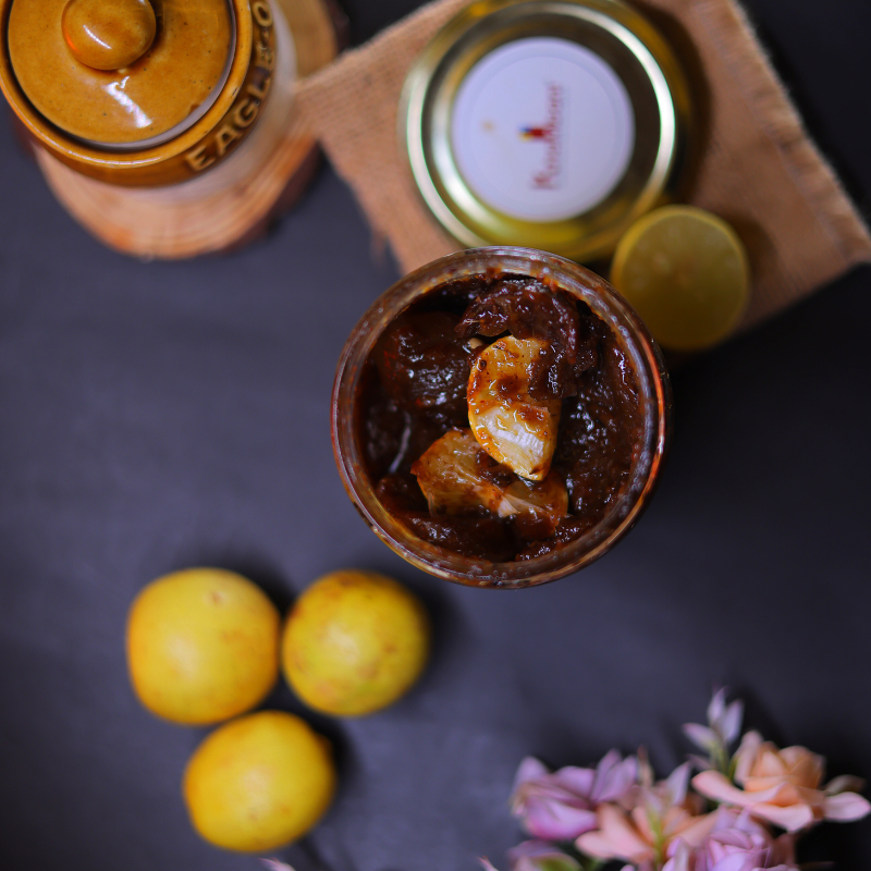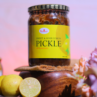 Khambani Sweet Lemon Pickle is a gentle, flavourful delight made with ripe lemons, jaggery, and a mild blend of traditional Indian spices. Each batch is sun-cured, combining the natural tartness of lemon with the mellow sweetness of jaggery to create a perfectly balanced taste that delights the whole family.